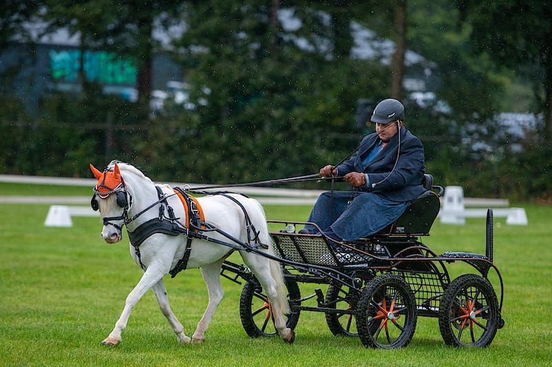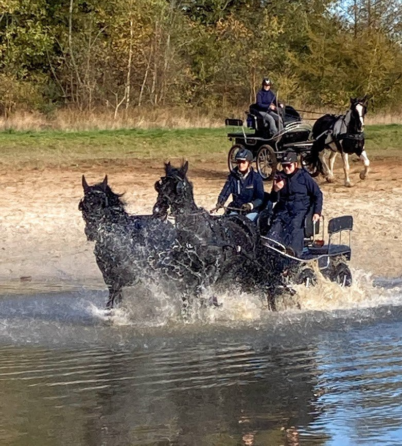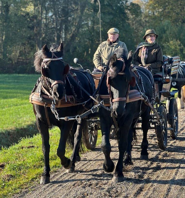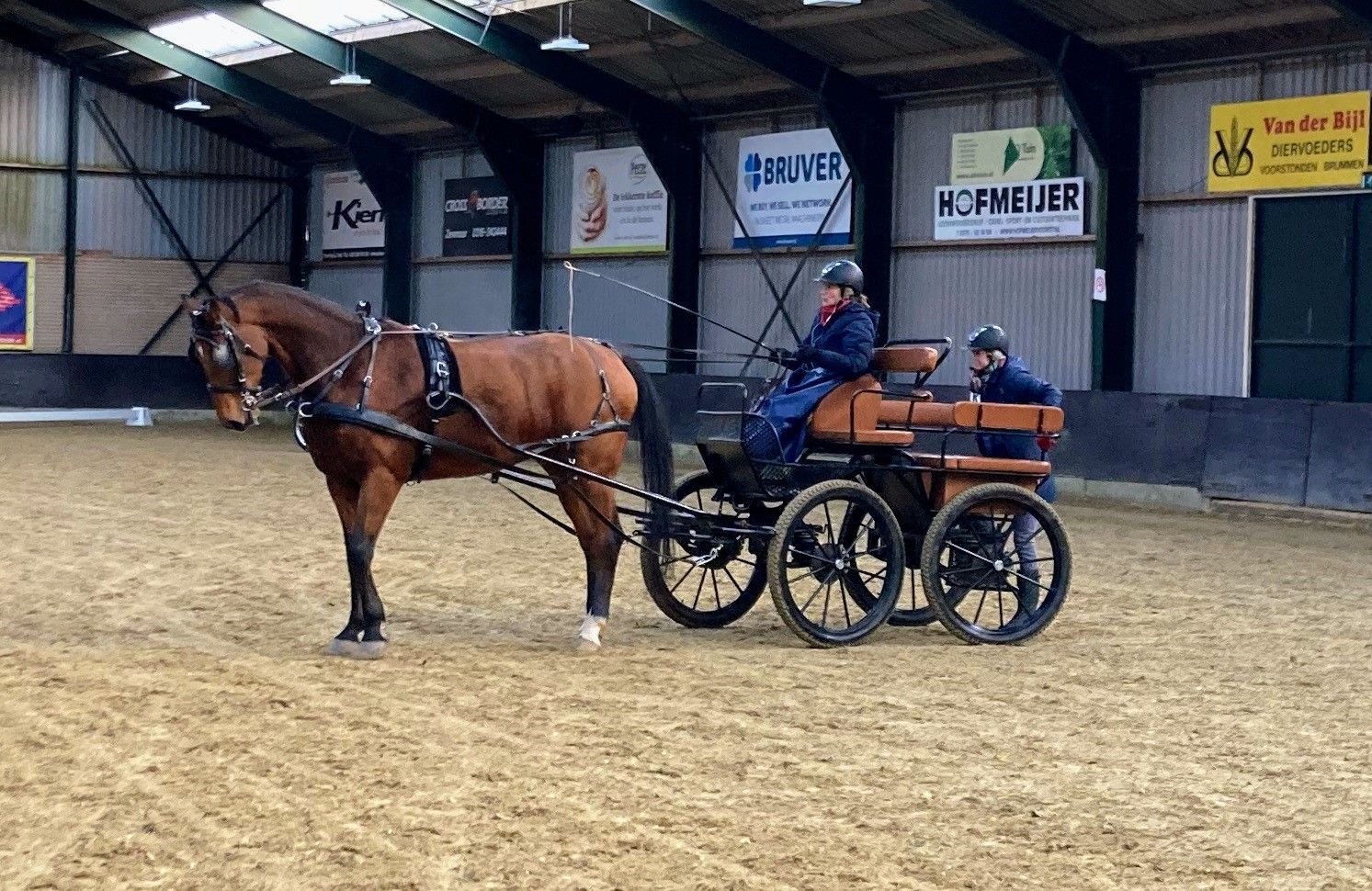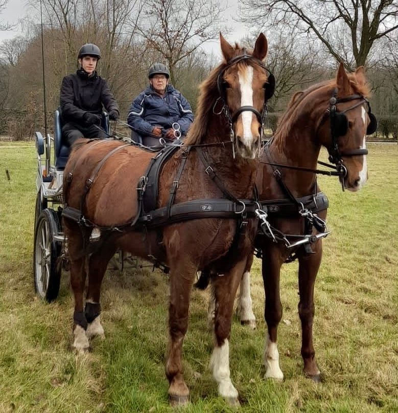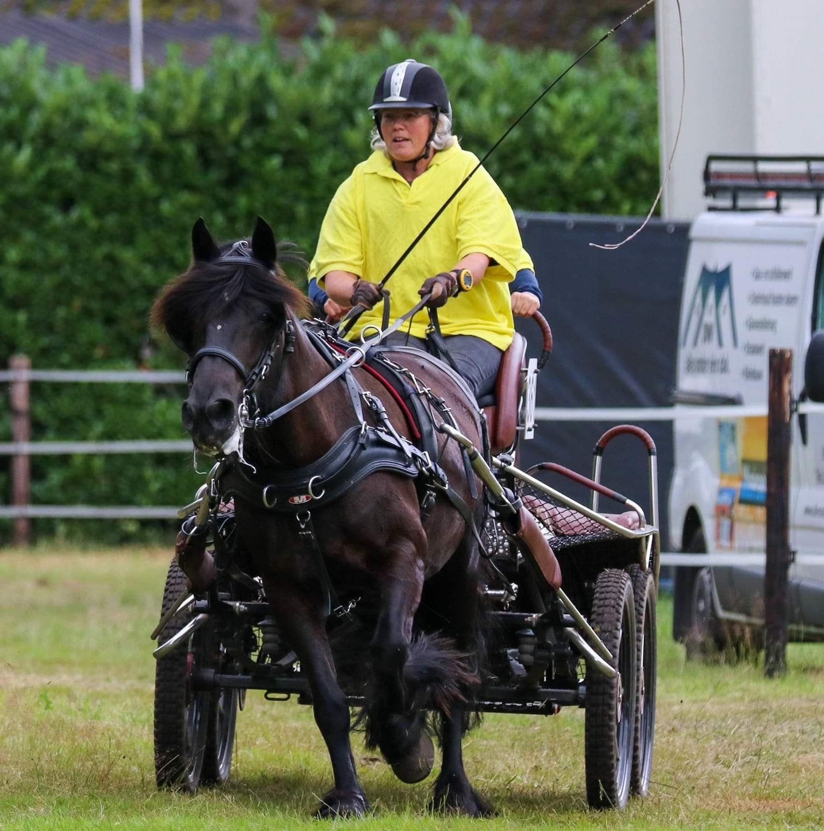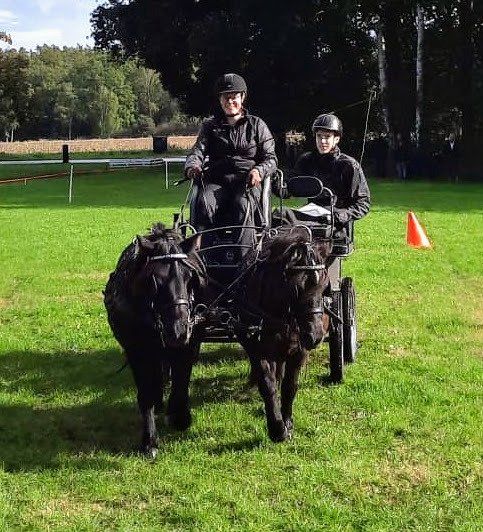 Met haar zoon Tygo als groom rijdt ze met een span shetlanders dressuur en vaardigheid en de colonne ritten met Tinker Rilana van medelid Sonja.