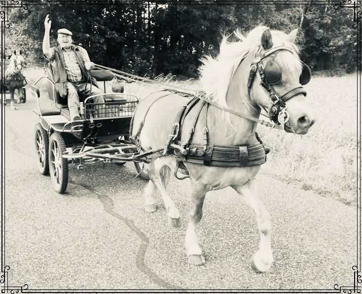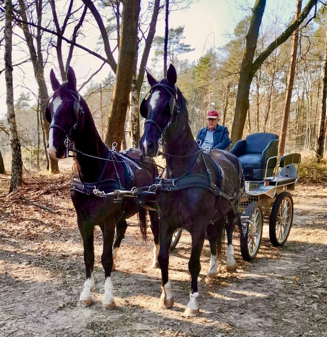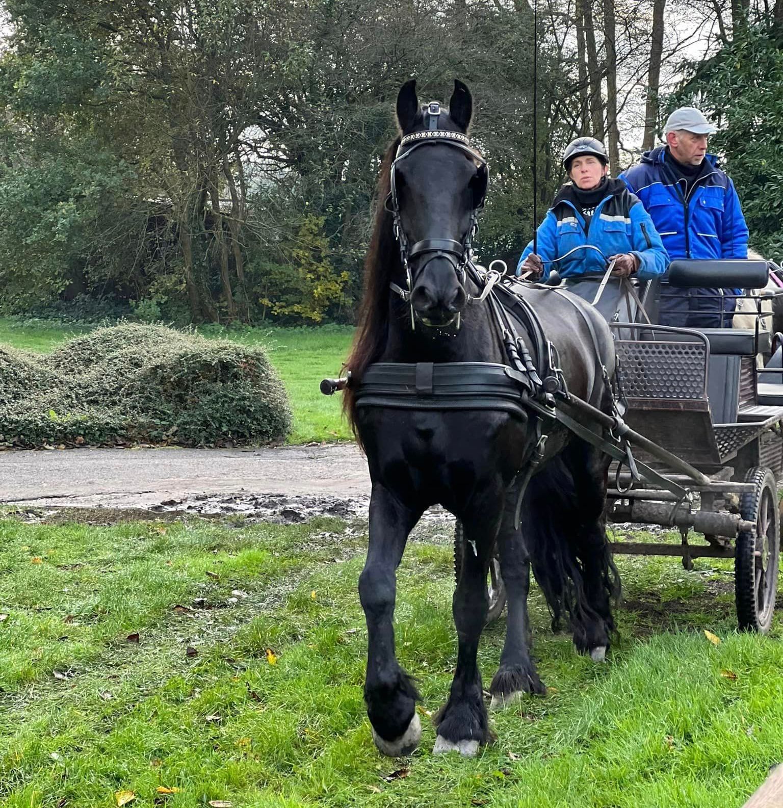 Deze mooie Arabo-Friezen lopen mee met verenigingsritten en staan regelmatig voor een authentieke jachtwagen. Echte blikvanger blijft echter de trouwe Thomas achterop.