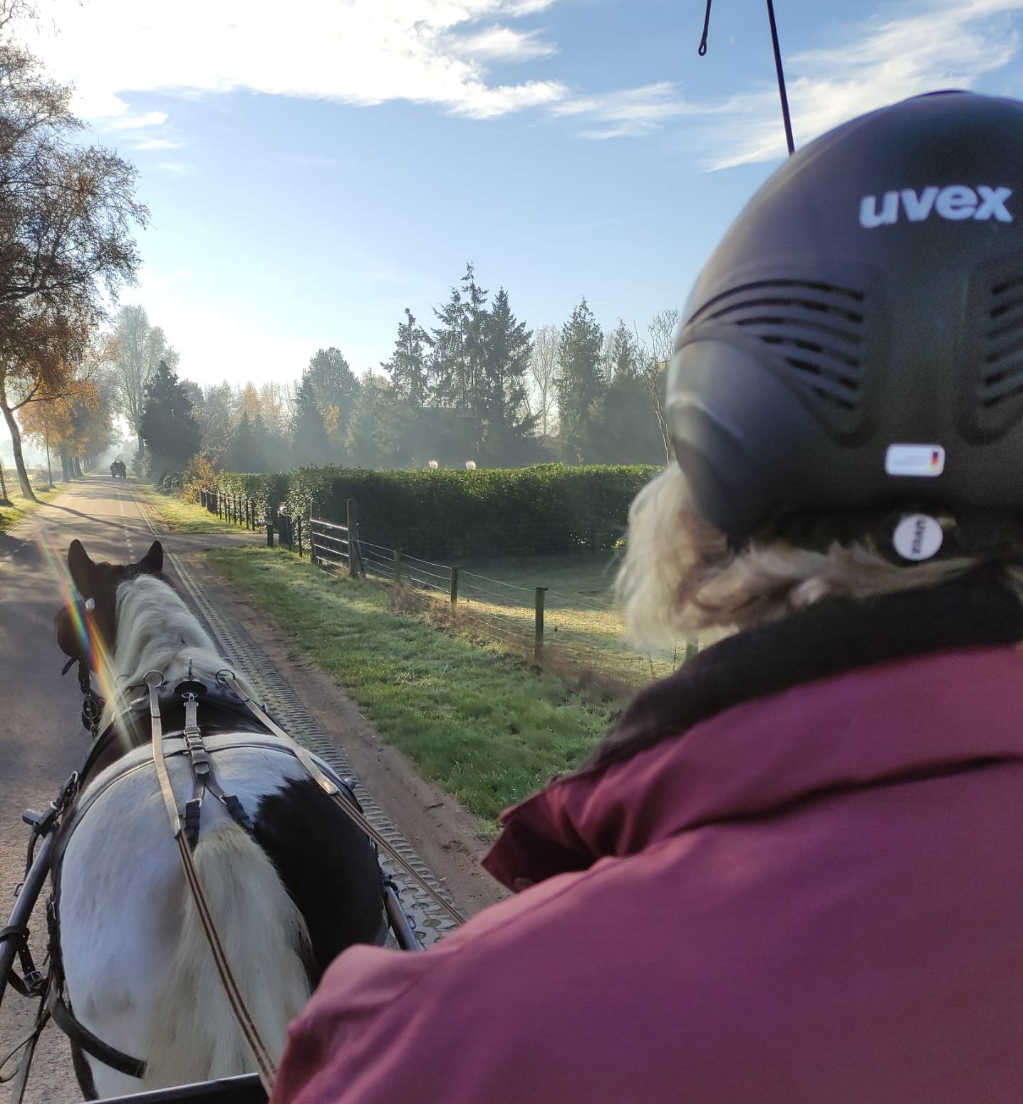 Tussen het kaasmaken door rijdt Michaela met groom Jolanda regelmatig de menlessen en buitenritten mee met haar mooie combinatie.